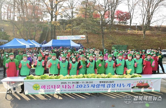 경북팩트뉴스 남유신 기자 | 고령군 새마을부녀회(회장 이한숙)는 11월 24일부터 26일까지 3일간, 새마을지도자 200여 명이 참석한 가운데 행복밥상 나눔터(구, 고령군공동급식소)에서 ‘아름다운 나눔! 2025 사랑의 김장 담가주기’ 행사를 개최했다.