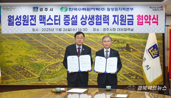 경북팩트뉴스 남유신 기자 | 경주시는 지난 26일 한국수력원자력 월성원자력본부(본부장 권원택)와 ‘맥스터 증설에 따른 상생협력 지원금 제공을 위한 업무협약(MOU)’을 체결하며 상생협력 지원금 280억 원을 확보했다고 밝혔다.