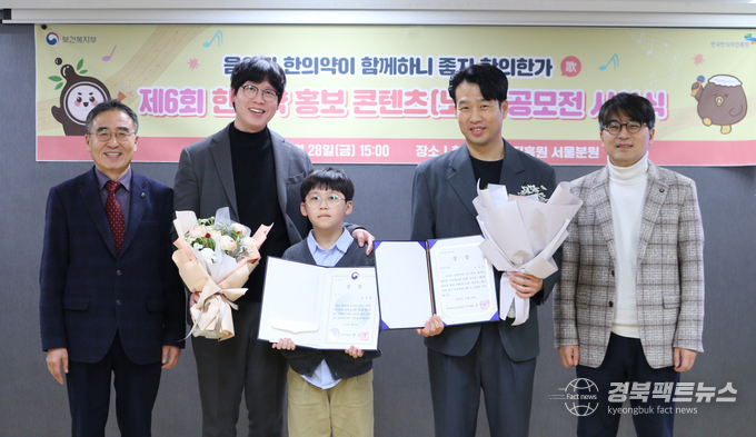 경북팩트뉴스 남유신 기자 | 한국한의약진흥원(원장 직무대행 송수진)은 지난 11월 28일 서울분원에서 ‘제6회 한의약 홍보 콘텐츠(노래) 공모전’ 시상식을 개최했다. 대상(보건복지부 장관상)은 정지훈 씨의 ‘허니(Honey), 한의약!’이 선정됐다.