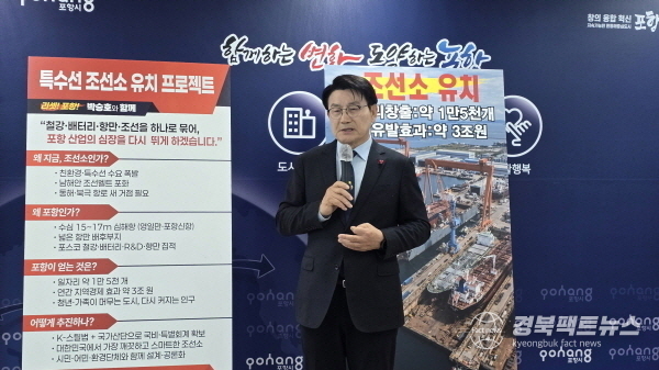 박승호 출마 예정자는 “조선소 유치는 아직 확정된 사업이 아니라 포항이 반드시 도전해야 할 국가 프로젝트”라며 “K-스틸법과 북극 항로 시대라는 흐름 속에서 포항이 기회를 붙잡을 수 있도록 시민과 함께 준비해 나가겠다”고 밝혔다.