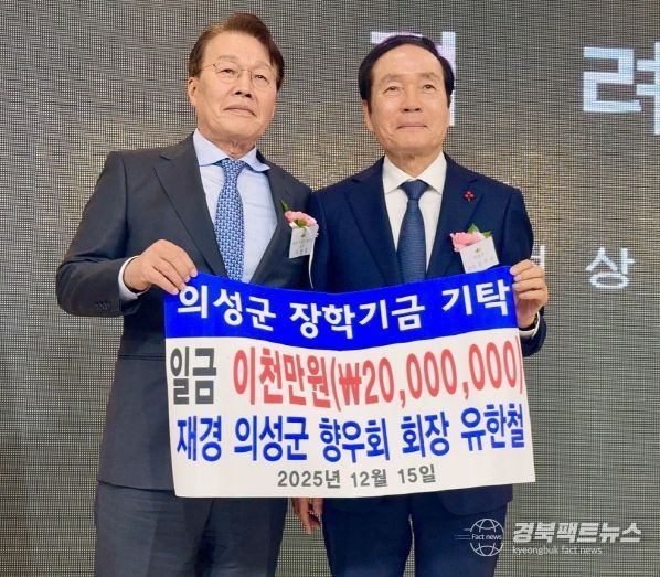 경북팩트뉴스 남유신 기자 | 재단법인 의성군인재육성재단(이사장 김주수 의성군수)은 지난 15일 재경의성군향우회 유한철 회장(서울승합 대표)이 지역 인재 육성을 위해 사용해 달라며 장학금 2천만 원을 의성군에 전달했다고 밝혔다.