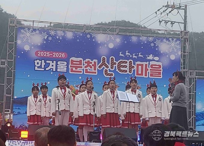 경북팩트뉴스 남유신 기자 | 봉화군 소천면 분천산타마을에서 지난 20일(토) 개최된 ‘2025 한겨울 분천산타마을 개장식’ 이 지역주민과 관광객들의 열띤 호응 속에 성황리에 열렸다. 이번 개장 축하공연에는 봉화교육지원청이 운영하는 봉꽃송이 청소년 합창단이 참여하여 한겨울 추위를 녹이는 따뜻한 무대를 선사했다.