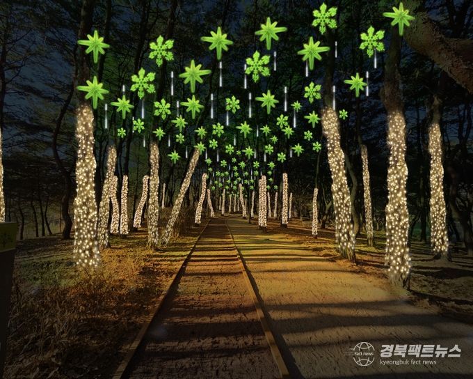 경북팩트뉴스 남유신 기자 | 경상북도는 도청 신도시의 대표 녹지 공간인 천년숲이 올겨울 빛으로 새 옷을 입는다. 연말연시를 맞아 황톳길과 산책로 일대에 경관조명이 설치되면서 또 다른 겨울밤 숲의 풍경을 선보인다.