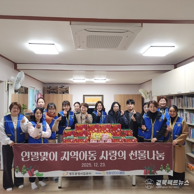 이번 행사는 연말연시를 맞아 지역사회에 나눔 문화를 확산시키고, 지역아동들이 따뜻하고 행복한 연말을 보낼 수 있도록 돕기 위해 마련됐다. 이날 행사에는 청도원화로타리클럽(회장 김수진)도 함께 참여해 관내 지역아동센터 이용 아동 20가구에 선물을 전달하며 나눔의 의미를 더했다.