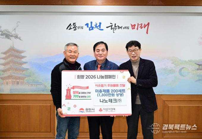 경북팩트뉴스 남유신 기자 | 김천시는 지난 23일, 나노테크㈜(대표 김정헌)으로부터 어려운 이웃을 위한 미용 제품 200상자(1,300만 원 상당)를 전달받았다고 밝혔다.