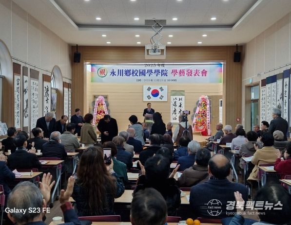 경북팩트뉴스 남유신 기자 | 영천향교 국학학원(원장 이덕기)은 지난 23일 본원 3층 대강당에서 관내 단체장과 수강생 등 200여 명이 참석한 가운데 ‘2025년 정기 학예발표회’를 성황리에 개최했다.