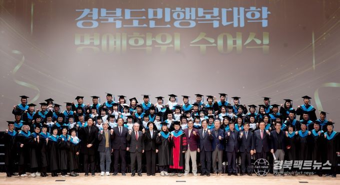 경북팩트뉴스 남유신 기자 | 경상북도는 24일 도청 동락관에서 경북도민행복대학 21개 시군 캠퍼스(학사) 및 6개 대학캠퍼스(석·박사) 관계자 등 600여 명이 참석한 가운데, 학사 866명, 석사 142명, 박사 60명 등 총 1,068명에 대한 ‘경북도민행복대학 명예학위 수여식’을 개최했다.