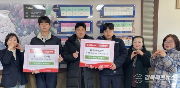 경북팩트뉴스 남유신 기자 | 화남면은 30일 영천전자고등학교에서 비즈쿨·또래상담 동아리 운영을 통해 마련한 수익금 각 100만원과 20만원, 총 120만원을 ‘희망2026 나눔캠페인’ 성금으로 기탁했다고 밝혔다.