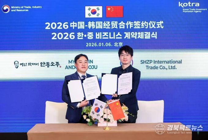 경북팩트뉴스 남유신 기자 | 안동시는 대한민국 전통 증류주인 안동소주가 2026 한․중 비즈니스 파트너십 행사에서 중국 유력 주류 유통사와 미화 140만 달러(한화 20억 원) 규모의 수출 계약을 체결했다고 1월 7일 밝혔다.