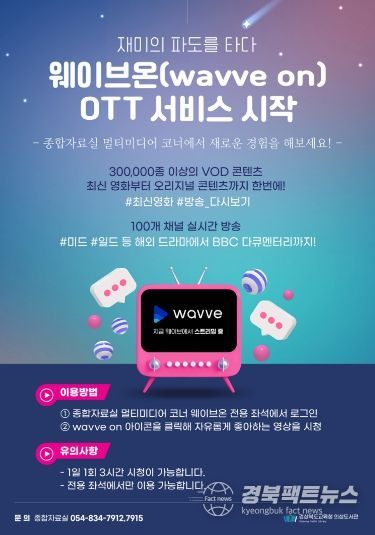 경북팩트뉴스 남유신 기자 | 경상북도교육청 의성도서관(관장 이미경)은 오는 13일부터이용자가 필요로 하는 영상을 실시간으로 제공하는 ‘웨이브온 VOD(Video On Demand)’ 서비스를 운영한다고 밝혔다.