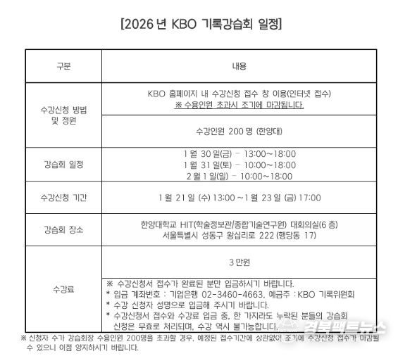 경북팩트뉴스 남유신 기자 | 2026년 KBO 기록강습회가 1월 30일(금)부터 2월 1일(일)까지 서울 한양대학교에서 개최된다. 기록강습회는 야구 공식기록법의 보급과 이해를 통한 저변 확대를 목적으로 프로야구 원년인 1982년부터 개최됐다.