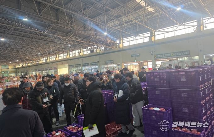 이날 경매 현장에는 이현주 농업기술센터소장을 비롯해 대경사과원예농협 포항APC장장, 도매시장 법인대표, 도매시장 및 관계자 등이 참석했다.