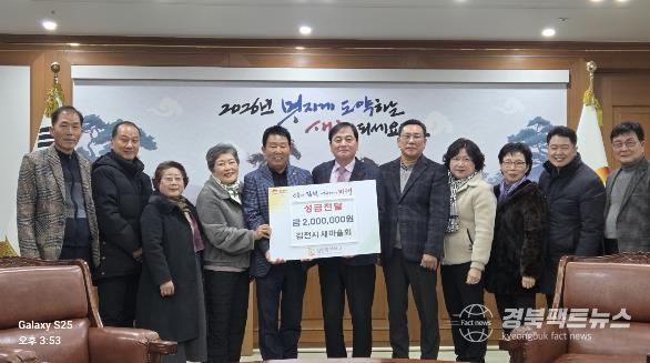 이날 성금 기탁을 위해 김천시청에 방문한 김덕수 새마을회장은 “이번 기탁이 우리 주변의 어려운 이웃들을 돕는 데 조금이나마 보탬이 되기를 바라며, 앞으로도 김천시새마을회는 끊임없는 봉사를 통해 따뜻한 김천을 만들어 나가는 데 최선을 다하겠다.”라고 말했다.