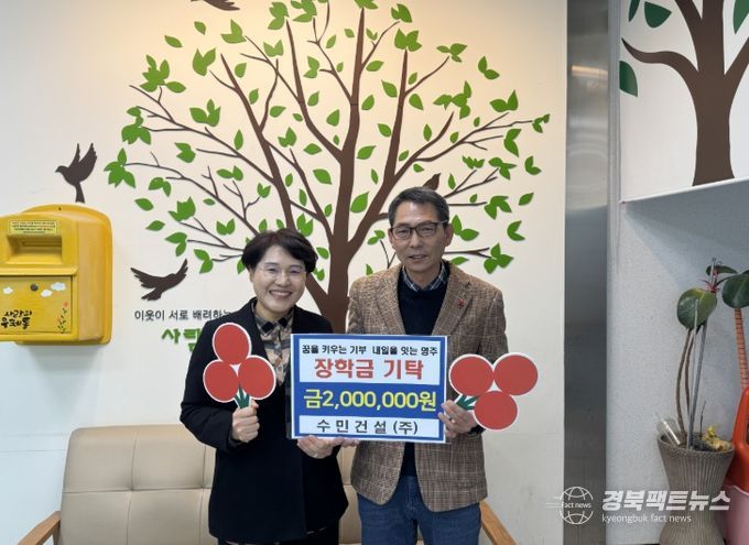 경북팩트뉴스 남유신 기자 | 영주시 수민건설 주식회사(대표 김효식)는 지난 20일 가흥1동 행정복지센터(동장 안순기)를 방문해 새로운 세상을 향해 첫발을 내딛는 예비 대학생을 위한 ‘응원 장학금’ 200만 원을 기탁했다.