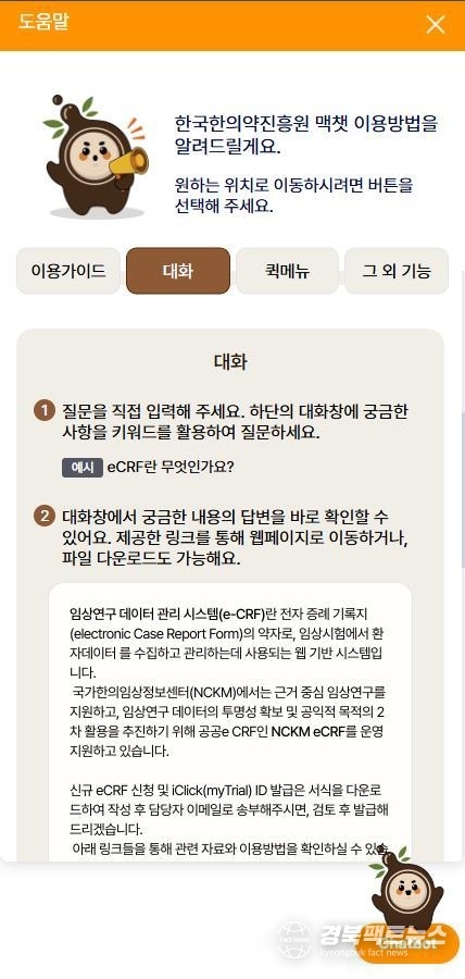 경북팩트뉴스 남유신 기자 | 한국한의약진흥원(원장 직무대행 송수진)은 지난 26일부터 한의약 특화 인공지능(AI) 챗봇 서비스인 ‘맥챗(MAC-Chat)’을 공식 운영한다고 밝혔다.