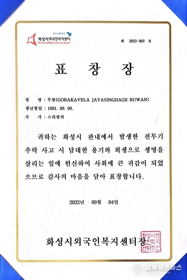 경북팩트뉴스 남유신 기자 | 지난 2022년 서해상에서 발생한 공군 전투기 추락 사고 당시 조종사 2명의 생명을 구한 스리랑카 국적 근로자가 현재 체류 기간 만료와 건강 악화로 어려움을 겪고 있는 사실이 뒤늦게 알려져 주변에서 도움의 손길을 호소하고 있다.