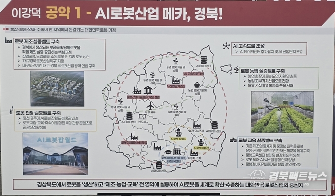 구체적으로는 구미·포항·영천을 잇는 로봇제조 실증벨트 구축과 내륙·북부 지역의 로봇농업 실증벨트 조성, 영천·경주 중심의 AI·로봇 체험·관광 벨트 조성, 교육도시 경산의 로봇 교육·인재 양성 벨트 구축 등을 제시하며 “경북에서 로봇을 만들고 현장에서 실증한 뒤 세계로 수출하는 완결형 산업 생태계를 구축하겠다”고 말했다.