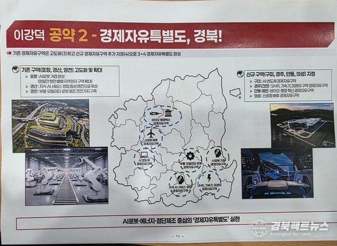 또한 기존 포항·구미·영천 경제자유구역을 고도화하는 동시에 의성·안동·경주·경산 등 4곳을 신규 경제자유구역으로 지정해 경북 전역을 하나의 산업 네트워크로 묶고, 총 7개의 경제자유구역을 기반으로 한 ‘경북 경제자유특별도’를 완성하겠다는 청사진도 내놨다.