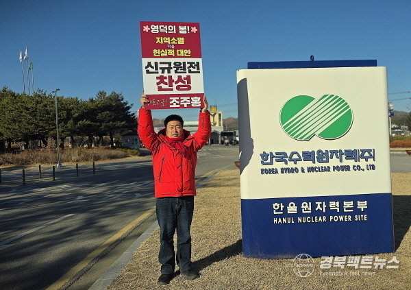 경북팩트뉴스 남유신 기자 | 조주홍 영덕군수 출마 예정자(전 국회부의장 선임 비서관)는 지난 2일 한울원자력본부에서 영덕에 신규 원전 유치를 찬성하는 1인 시위를 펼쳤다.