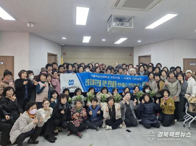 경북팩트뉴스 남유신 기자 | 가톨릭 상지대학교 RISE 사업단과 피움교육문화컨설팅은 2월 3일 임하면 복지회관에서 산불피해지역 이재민 100여 명을 대상으로 웃음치료 및 문화생활 프로그램을 진행했다.