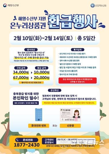 경북팩트뉴스 남유신 기자 | 해양수산부가 주최하는 ‘수산물 온누리상품권 환급 행사’가 오는 2월 10일부터 14일까지 5일간 영덕전통시장 및 강구시장에서 진행된다.
