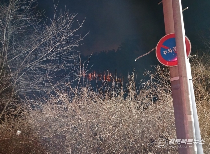 포항북부소방서 등에 따르면 2월 10일 오전 1시 9분경 포항시 북구 장성동 산254-1번지 인근 야산에서 “산 쪽에서 연기와 불꽃이 보인다”는 신고가 접수됐다.