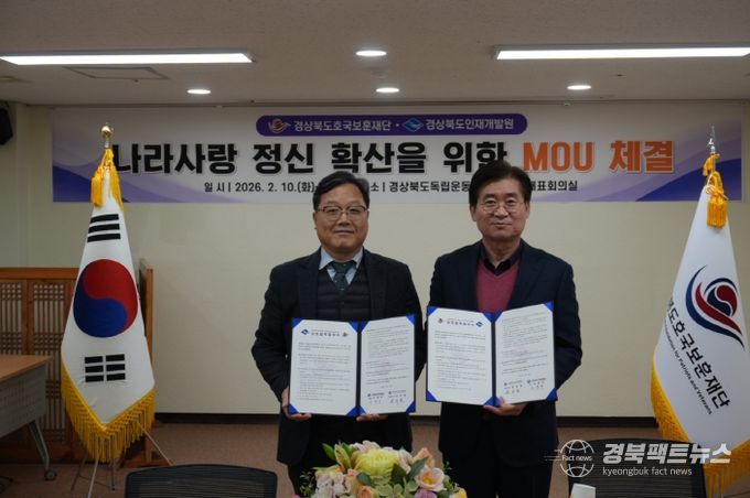 경북팩트뉴스 남유신 기자 | 경상북도인재개발원(원장 우광진)과 (재)경상북도호국보훈재단(대표이사 한희원)은 2월 10일 오후 2시, (재)경상북도호국보훈재단 국민대표회의실에서 나라사랑 정신을 계승·확산하기 위한 업무협약(MOU)을 체결했다.