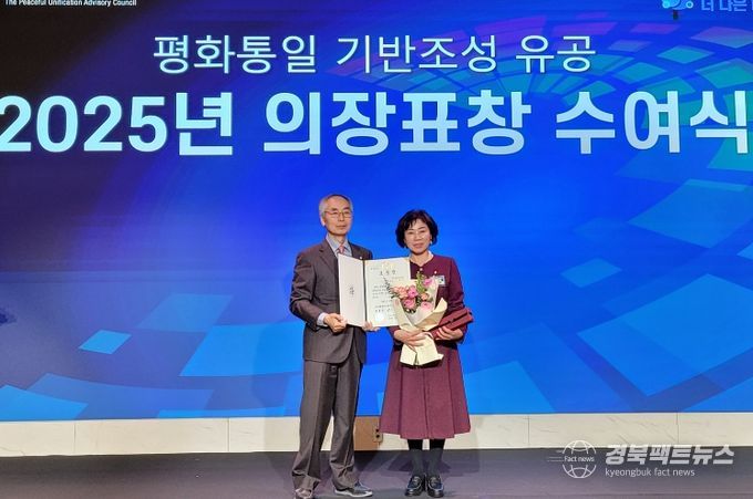 경북팩트뉴스 남유신 기자 | 민주평화통일자문회의 예천군협의회(회장 조경섭) 김재숙 자문위원은 11일 안동 스탠포드호텔에서 개최된 ‘2025년 민주평화통일자문회의 의장 표창 수여식’에서 의장(대통령) 표창을 수상했다.