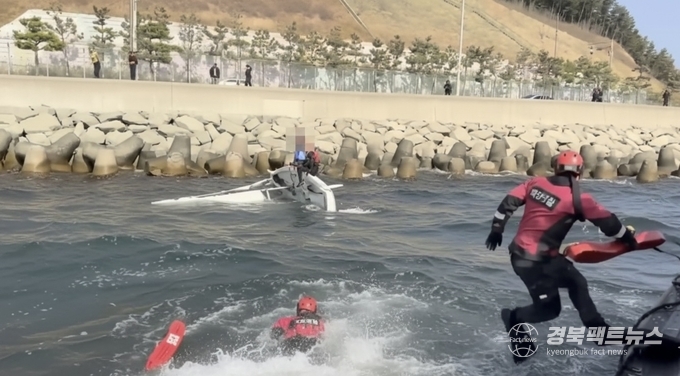 경북팩트뉴스 남유신 기자 | 포항해양경찰서(서장 이근안)는 2월 22일 오후 12시 13분경 환호항 남서쪽 약 0.5해리(0.9km) 해상에서 해양훈련 중이던 딩기요트가 전복됐다는 119 공동대응 신고를 접수하고 긴급 구조에 나섰다.