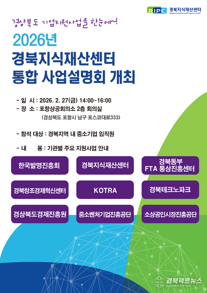 경북팩트뉴스 남유신 기자 | 포항상공회의소(회장 나주영)가 운영하는 경북지식재산센터는 오는 27일 오후 2시, 포항상의 2층 회의실에서 도내 중소기업 임·직원을 대상으로 「2026년 경북지식재산센터 통합 사업설명회」를 개최한다고 밝혔다.