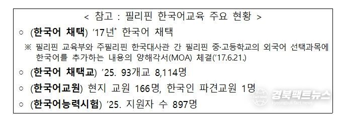 필리핀은 2017년에 현지 정규 교육과정의 외국어 과목으로 한국어를 정식 채택하는 것으로 결정하고, 2018년부터 한국어반을 운영해 왔다. 현재는 90여 개 학교에서 8,000여 명의 학생들이 한국어를 배우고 있다. 이번 양해각서는 한국 교육부가 필리핀 내 한국어 교사들을 위한 집중 연수 과정을 지원하여, 한국어교육 전문성을 높이도록 하는 내용이 핵심이다.