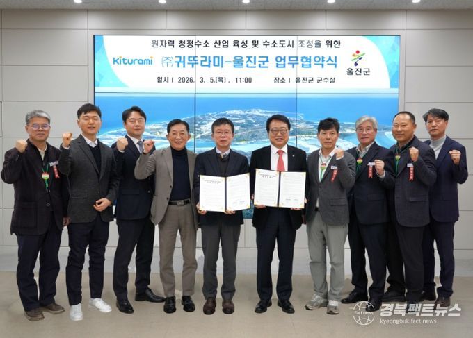 경북팩트뉴스 남유신 기자 | 울진군은 3월 5일 울진군청에서 에너지 설비 전문기업 ㈜귀뚜라미와 ‘원자력 청정수소 산업 육성을 위한 업무협약(MOU)’을 체결했다.
