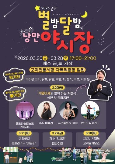 군 관계자는 “별빛과 달빛 아래에서 맛있는 음식과 공연을 함께 즐길 수 있는 낭만적인 야시장을 통해 군위전통시장이 지역의 대표 야간 명소로 자리잡기를 기대한다”며 많은 군민과 관광객들이 군위전통시장을 방문해 맛과 멋이 어우러진 군위의 밤을 함께 즐기시길 바란다“고 말했다.