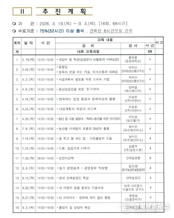 이번 청년농업인과정은 3월 19일 개강식을 시작으로 9월 3일까지 총 16회에 걸쳐 운영될예정이며 특히 변화하는 농업 환경에 발맞추어 청년농업인들이 현장에서 필요로 하는실질적인 지식과 기술을 전달하고 농촌의 안정적인 정착을 도모할 수 있는 다양한프로그램이 마련되어 기대를 모으고 있다.