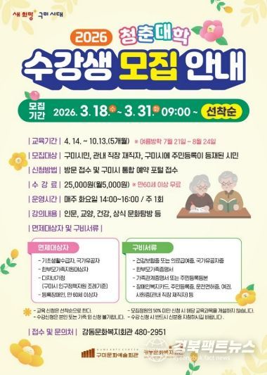 경북팩트뉴스 조현묵 기자 | 구미시강동문화복지회관은 3월 18일부터 3월 31일까지 ‘청춘대학’ 수강생을 모집한다.