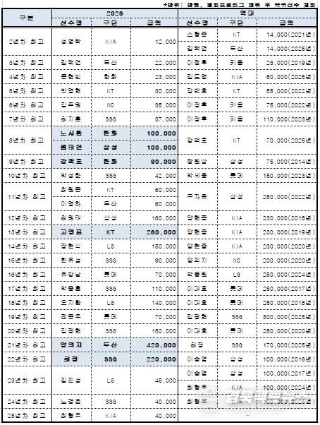 또한 2026시즌부터 시행되는 아시아쿼터 선수들의 연봉도 집계됐다. LG 웰스, SSG 타케다, 두산 타무라가 각각 20만 달러씩 받으며 아시아쿼터 선수 연봉(계약금 포함) 공동 1위에 올랐다.