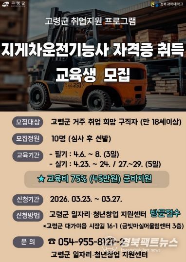 경북팩트뉴스 남유신 기자 | 고령군은 구직자의 취업 역량강화를 위해 '고령군 일자리·청년창업지원센터'주관으로 지게차운전기능사 취득 지원사업 교육생을 모집하고 있다.