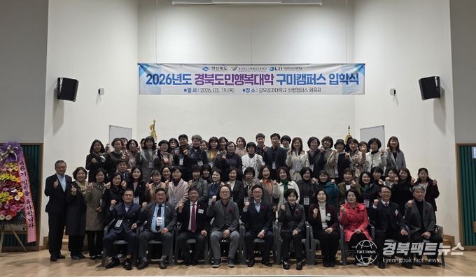 경북팩트뉴스 조현묵 기자 | 구미시는 19일 국립금오공과대학교 평생교육원 실내체육관에서 신입생 55명과 총동창회 회원 등 70여 명이 참석한 가운데 ‘2026년 제6기 도민행복대학 구미캠퍼스 명예학사과정 입학식’을 개최했다.