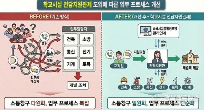 경북팩트뉴스 남유신 기자 | 경북교육청은 학교 시설 업무의 전문성과 효율성을 높이고 현장 중심의 신속한 지원 체계를 구축하기 위해 3월부터 학교와 기술직 공무원을 1대 1로 매칭해 전담 지원하는 ‘학교 시설 전담지원관제’를 본격 시행한다고 20일 밝혔다.
