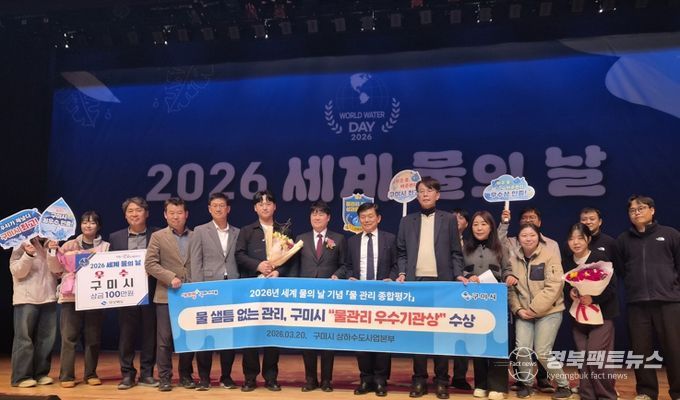 경북팩트뉴스 조현묵 기자 | 구미시 상하수도사업본부는 지난 20일 강동문화복지회관 봉두 아트홀에서 열린 ‘2026년 세계 물의 날’ 기념행사에서 경상북도 주관 우수기관 유공표창을 수상했다. 지난해 최우수 기관상에 이어 2년 연속 성과로, 물관리 정책 전반의 경쟁력을 다시 한 번 입증했다.