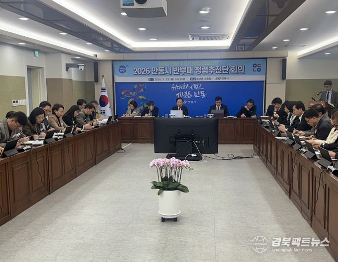 경북팩트뉴스 남유신 기자 | 안동시는 3월 23일 안동시청 웅부관 소통실에서 권기창 안동시장을 비롯한 부시장, 국․소장 등 간부공무원이 참석한 가운데 ‘2026년 반부패․청렴 추진단 회의’를 개최하고, 종합청렴도 향상을 위한 추진체계와 반부패․청렴 종합계획을 공유했다.