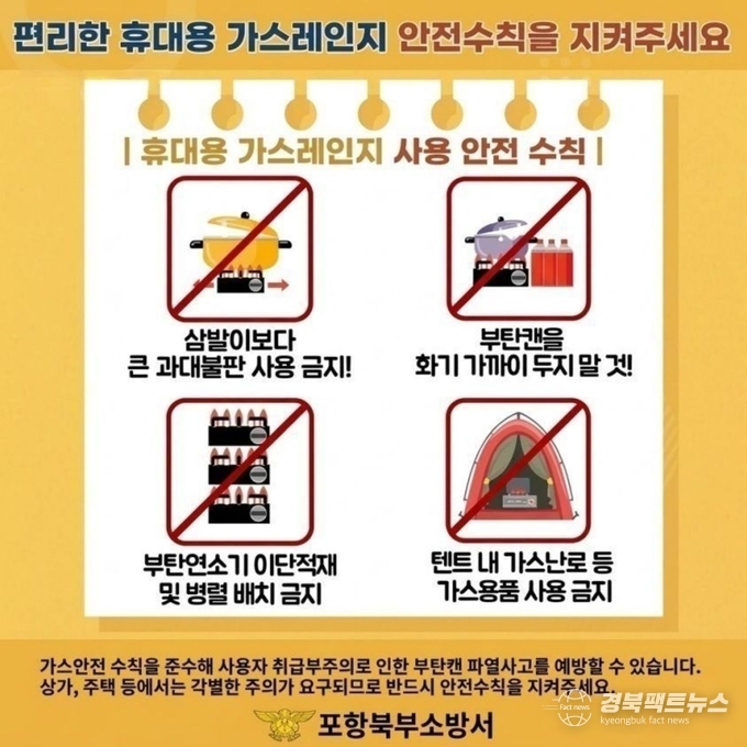 김장수 포항북부소방서장은 “편리한 휴대용 가스레인지가 한순간의 부주의로 큰 사고로 이어질 수 있다”며 “봄철 캠핑과 야외활동이 늘어나는 시기인 만큼 안전수칙을 철저히 지켜달라”고 당부했다.