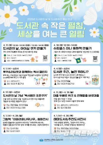 경북팩트뉴스 남유신 기자 | 경상북도교육청 의성도서관은 2026년 도서관의 날 및 도서관주간을 맞아 ‘도서관 속 작은 펼침, 세상을 여는 큰 열림’이라는 주제로 4월 한 달간 공연, 체험, 대출 이벤트 등 다양한 독서 문화 행사를 운영한다고 밝혔다.