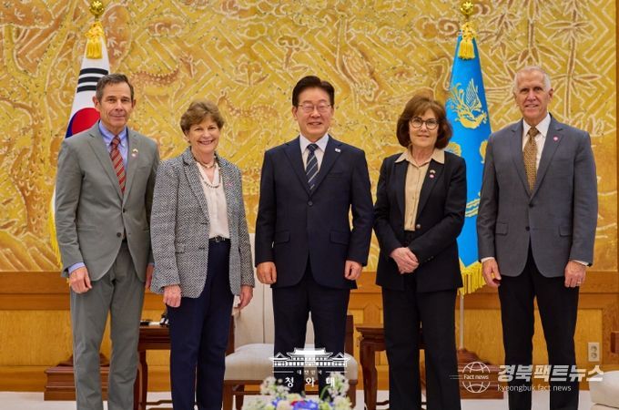 경북팩트뉴스 황혜경 기자 | 이재명 대통령은 4월 2일 오후 청와대에서 진 섀힌(Jeanne Shaheen) 상원 외교위원회 간사 등 공화·민주 양당 의원으로 구성된 미국 상원의원 대표단을 접견했다. 이 대통령과 미 대표단은 한미동맹 및 한반도 문제를 비롯해 중동 전쟁의 안보적·경제적 파장과 대응 방안에 대해 심도 있는 의견을 교환하고, 향후 경제적 여파 대응 과정에서 한미가 긴밀히 소통해 나가는 것이 중요하다는 점에 뜻을 같이 했다.