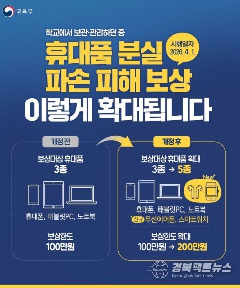 경북팩트뉴스 이경원 기자 | 학교에서 보관·관리하던 중 휴대품 분실·파손 피해 보상 이렇게 확대됩니다.
