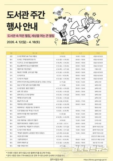 경주시립도서관 관계자는 “도서관 주간을 맞아 시민들이 책과 도서관을 더욱 가깝게 느낄 수 있도록 다양한 프로그램을 준비했다”며 “가족과 함께 도서관을 찾는 즐거운 시간이 되길 바란다”고 말했다.