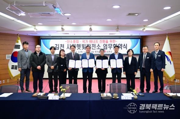 경북팩트뉴스 남유신 기자 | 김천시는 4월 2일, 대구지방환경청, 경상북도탄소중립지원센터, (사)누구나햇빛발전과 함께 ‘경북 1호 김천 시민햇빛발전소’건립을 위한 업무협약을 체결했다. 이번 협약은 공공 유휴부지를 활용해 시민이 참여하는 재생에너지 모델을 구축하기 위해 추진됐다.