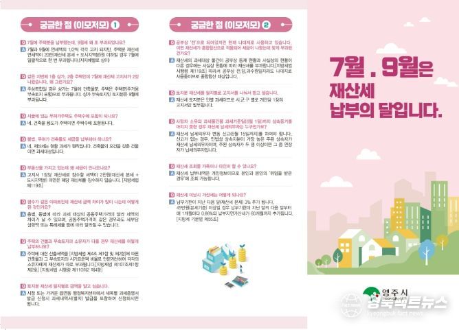 경북팩트뉴스 남유신 기자 | 영주시는 2026년 7월 정기분 재산세 부과를 앞두고 시민들의 세금 납부 이해도를 높이고 편의를 제공하기 위해 재산세 안내 리플릿을 제작·배부한다.