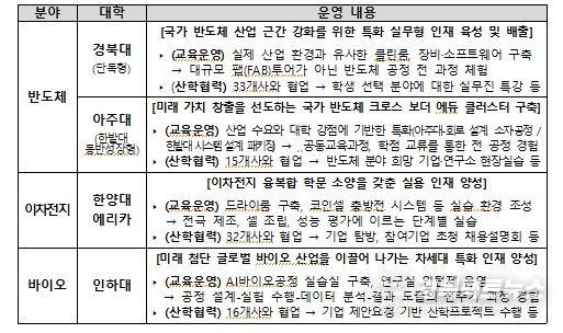 이번 성과교류회는 첨단산업 특성화대학의 특성화 전공 운영, 다각적 기업 협업, 학사 운영 개선 등 성공 사례를 확산하기 위하여 마련됐다. 올해는 경북대(반도체 단독형), 아주대(반도체 동반성장형), 한양대 에리카(이차전지), 인하대(바이오) 등 4개 대학이 우수 성과를 발표한다.