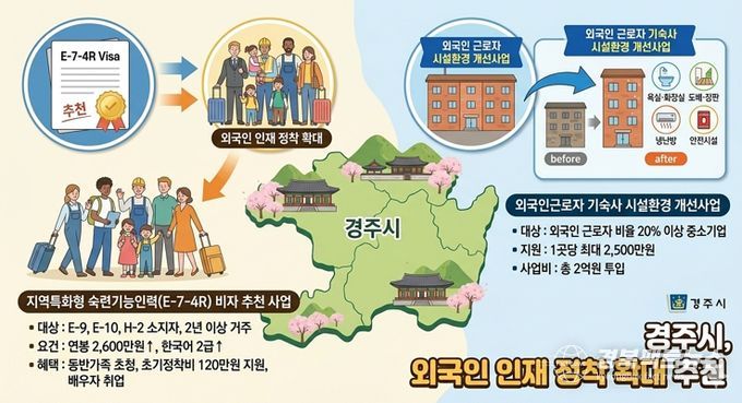 경북팩트뉴스 남유신 기자 | 경주시는 외국인 인재 정착을 확대하기 위해 ‘지역특화형 숙련기능인력(E-7-4R) 비자 추천 사업’과 ‘외국인 근로자 기숙사 시설환경 개선사업’을 추진한다고 19일 밝혔다.